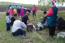 Бакчабызның җыр-биюгә оста балалары кырда эшләүчеләрнең төшке ялы вакытында чыгыш ясап кайттылар.Алар игенче һөнәре белән якыннан таныштылар, кыр ашы белән сыйландылар.