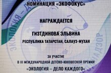 Ученица 6 класса Гизтдинова Эльвина удостоена Грамоты за участие в III международной детско-юношеской премии "Экология-дело каждого". Руководитель- Шайхулова Ч.А.