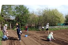 Мәктәп бакчасында язгы эшләр дәвам итә: бәрәнге, чәчәкләр утыртылды, чүп үләннәре белән көрәш башланды.