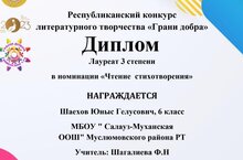 6 нчы сыйныф укучысы Шаехов Ю.Г. "Игелеклелек чикләре" республикакүләм әдәби иҗат конкурсында 3 нче дәрәҗә дипломга лаек булды.