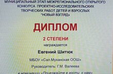 Балалар һәм өлкәннәр арасында үткәрелгән "Яңа караш" иҗади - тикшененү эшләренең регионара ачык конкурсының муниципаль этабында Шитюк Евгений 2 нче дәрәҗә дипломга лаек булды. Җитәкчесе - Валеева Г.М. Котлыйбыз! Уңышлар телибез!