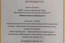 8 класс укучысы Шитюк Е. Е. "English Art Festival" конкурсында 2 урын яулады.