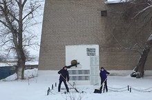 Укучылар көче белән һәйкәл тирәсе кардан арындырып торыла