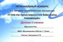 В целях развития коммуникативной компетенции учащихся на иностранном языке и вовлечения их в активную творческую деятельность по совершенствованию социокультурной, лингвострановедческой компетенции, совершенствования навыков практического применения знаний по использованию ИКТ технологий и изучению иностранных языков, МБОУ "СОШ 39" города Набережные Челны, организовал региональный конкурс по английскому и немецкому языку на лучшую тематическую экскурсию " I love my native town" / " Ich liebe meine Heimatstadt". Ученик 5б класса, Ибрагимов Раяз стал дипломантом II степени. Он выполнил творческую работу в виде презентации по теме конкурса.