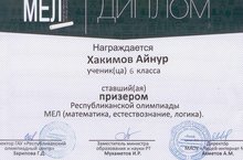 Ученик 6а класса Хакимов Айнур стал призером Республиканской олимпиады МЕЛ (математика, естествознание, логика).Учитель Хайртдинова И.Р.Поздравляем и желаем новых побед нашим!!!