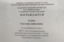 Ученица 8 класса нашей школы Агеева Светлана стала призером заключительного этапа республиканской олимпиады школьников по татарскому языку(учитель Гульчачак Даутова). Поздравляем! Желаем дальнейших успехов.