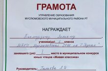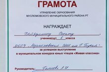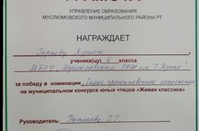 Мөслим лицее базасында узган "Живая классика" муниципаль яшь китап укучылар конкурсында уңышлы чыгыш ясаганы өчен 6 нчы а сыйныфы укучысы Хайруллина Рената (укытучысы Галиева Л.И.) бүләкләнә.