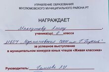 Мөслим лицее базасында узган "Живая классика" муниципаль яшь китап укучылар конкурсында уңышлы чыгыш ясаганы өчен 6 нчы а сыйныфы укучысы Максутова Алина (укытучысы Галиева Л.И.) бүләкләнә.