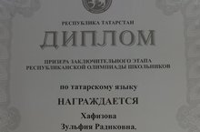 Ученица 10 класса школы Хафизова Зульфия стала призером заключительного этапа республиканской олимпиады школьников по татарскому языку(учитель Гульчачак Даутова). Поздравляем! Желаем дальнейших успехов.