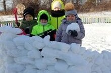 Дети на свежем воздухе играют в различные игры.Вместе мы построили крепость из снега.