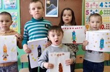 На день космонавтики дети нарисовали рисунки по теме "Звездное небо".Познакомились с биографией первого космонавта Ю.Гагарина.
