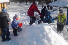 Сегодня на участке мы дружно делали горку./Балалар бүген тау ясадылар.