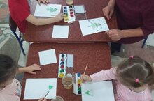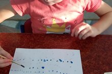 На занятие закрепили приёмы рисования кисточкой точки и мазки ,равномерно распределяя их по всему листу.