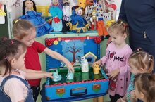 Сөйләм телен үстерү максатыннан, "Әкиятне дәвам ит"дидактик уены, театр уенчыклары ярдәмендә үткәрелде. С использованием театра игрушек развиваем связную речь "Я начну ,ты продолжи".