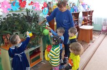 Балалар белән бүлмә гөлләре белән танышуны дәвам итү,аларны чәчәкләре,яфраклары буенча аеру,су сибү.Сегодня научились ухаживать за комнатными растениями,называли их части.
