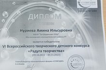 Ученица 3 класса Нуриева Амина, получила диплом 1 степени во Всероссийском конкурсе "Радуга творчества"