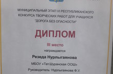 9 нчы сыйныф укучысы Нурлыгаянова Резеда республикакүләм "Куркынычсыз юллар" конкурсның муниципаль этабында 3 нче урынны яулады.