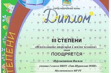Ученица 2 класса Нурлыгаянова В. заняла 3 место в респуубликанском конкурсе "Юннат" в номинации "Использование вторсырья в жизни человека"
