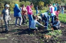 На школьном участке продолжются сельскохозяйственные работы, территория очищается от мусора, вскапывается земля.