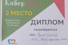 Ки́берспо́рт ,также известен как «компью́терный спорт» или «электро́нный спорт»— командное или индивидуальное соревнованиена основе компьютерных видеоигр. В России признан официальным видом спорта. Наш ученик Нуриев И. заслуженно занял 2 место по киберспорту среди детей 12-16 лет. Руководитель: Нагимов М.