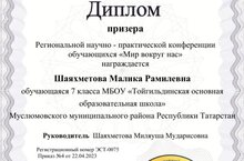 На региональной научно-практической конференции "Мир вокруг нас" наша ученица Шаяхметова м. стала призером. Руководитель: Шаяхметова М. М. Поздравляем!