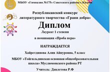 Очередные успехи Давлетовой Р. Ф. и ее учеников: 1 и 3 места в номинации "Проба пера" на республиканском конкурсе литературного творчества "Грани добра"