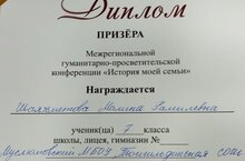 Поздравляем нашу ученицу Шаяхметову м. р. и ее научного руководителя с большими успехами. Большая честь быть призером межрегиональной гуманитарно-просветительской конференции "История моей семьи". Желаем дальнейших успехов.