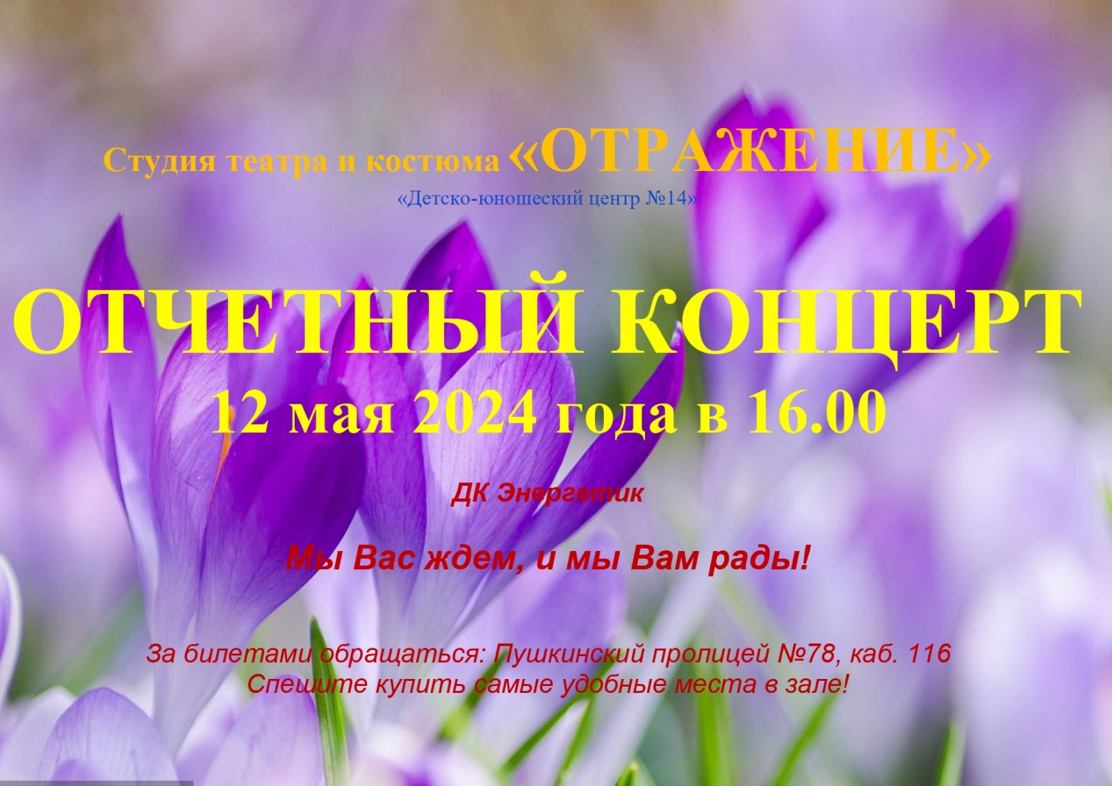 Друзья, спешим сообщить о дате и времени нашего ЕЖЕГОДНОГО ОТЧËТНОГО КОНЦЕРТА студии театра и костюма «Отражение»Дата:12 мая 2024 года в 16:00ДК «ЭНЕРГЕТИК»Вас ждут ЯРКИЕ НОМЕРА, коллекции и танцы - поставленные нашими талантливыми педагогами, КРАСОЧНЫЕ КОСТЮМЫ - разработанные нашими кудесницами - дизайнерами, ЗАВОРАЖИВАЮЩАЯ, ПРЕКРАСНАЯ МУЗЫКА, которая погрузит Вас в атмосферу творчестваЖдëм Вас на нашем празднике и помните, что КРАСОТА, ЛЮБОВЬ И ТВОРЧЕСТВО СПАСУТ НАШ МИР!Билеты можно приобрести по адресу:Пушкинский пролицей 78, каб. 116Студия театра и костюма «ОТРАЖЕНИЕ»Или позвонив по номеру +79375737338 Светлана Юрьевна