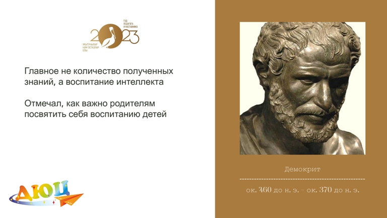 В Год педагога и наставника представляем вашему вниманию подборку педагогических идей древних философов: Сократа, Платона, Демокрита и Аристотеля. Древние философы, в отличие от нас, не имели возможности воспользоваться современной техникой, поэтому они были вынуждены искать решения сложных вопросов в рамках конкретных ситуаций. Они искали пути решения проблем в каждом отдельном случае, используя для этого свои знания и опыт. Поэтому их педагогические идеи и по сей день интересны и актуальны.