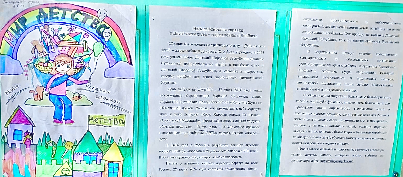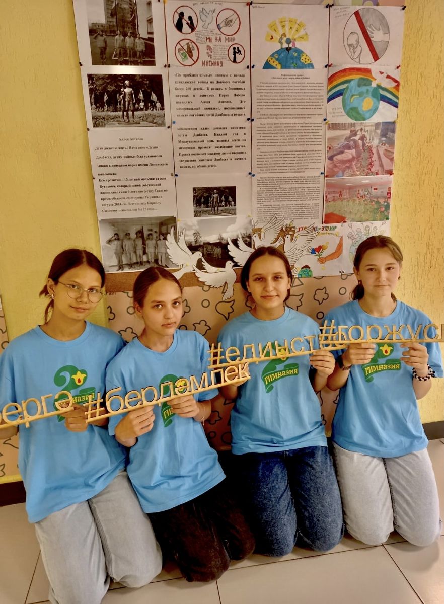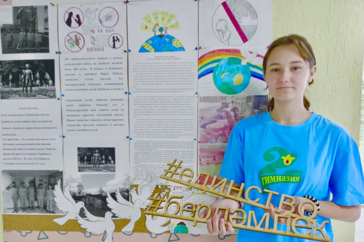 Балалар бу гаепсез корбаннар истәлегенә Донецкның Җиңү паркында фәрештәләр аллеясы барлыкка килүен белделәр. Таш стелада алфавит тәртибендә бу сугышта һәлак булган Донбасс балаларының исемнәре уеп язылган, шулай ук аларның яше күрсәтелгән. Чара Донбассның кечкенә фәрештәләре истәлегенә бер минут тынлык белән тәмамланды. Сугыш корбаннары булган Донбасс балалары истәлегенә ак күгәрченнәр ясалды , алар безгә вакытсыз киткән Донбасс фәрештәләрен искә төшерә. Укучылар әлеге вакыйга турында өстәмә мәгълүматны гимназия диварына эленгән стендтан да укып белделәр, үзләре ясаган күгәрченнәрне элделәр.