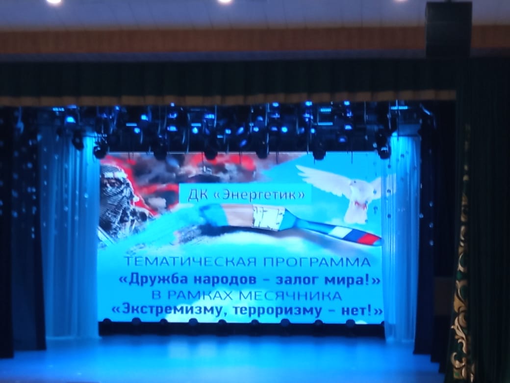 "Экстремизмга-юк!" айлыгы кысаларында шәһәрнең "Энергетик"мәдәният йортында "Халыклар дуслыгы- тынычлык нигезе" дигән тематик программа буенча чара узды. Гимназиянең 8а сыйныф укучылары ( сыйныф җитәкчесе Заһитова Зөлфия Мөхәммәтнур кызы) әлеге чарада катнаштылар. Без илләр, халыклар дус булуын, кеше гомеренең вакытсыз өзелмәвен, күз яшьләренең түгелмәвен телибез.