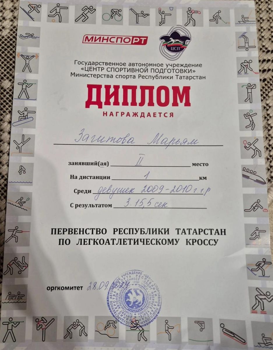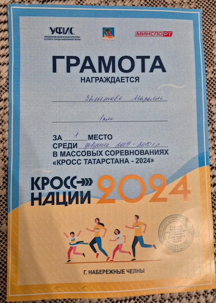 Гимназиянең 8 нче сыйныф укучысы Заһитова Мәрьямне йөгерү буенча «Кросс наций» ярышындагы чираттагы җиңүе белән котлыйбыз. Афәрин, Мәрьям! Киләчәктә Чаллы шәһәре спортчылары данын еракларга жибәрерсең, дип ышанабыз ! Чемпионнар безнең арада!