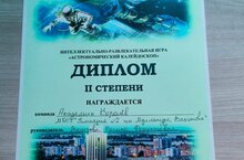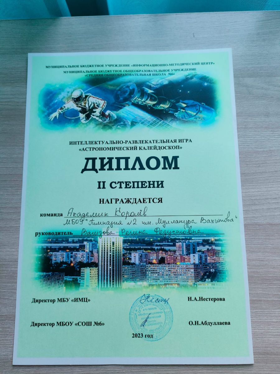Гимназия укучылары 6 нчы мәктәп базасында оештырылган Космонавтика көненә багышланган ,,Астрономик калейдоскоп " шәһәркүләм интеллектуаль күңел ачу уенында катнашып, 22 команда арасында 2 урын яуладылар. Команданы ярышка әзерләгән Вагизова Регина Федуст кызын, гимназиянең 7а сыйныф малайларыннан торган ,,Академик Королев" командасын әлеге уңышлары белән котлыйбыз!