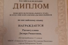 Инглиз теленнән республикакүләм олимпиадада ҖИҢҮЧЕ булган 11А сыйныф укучысы Рахматуллина Диләрәне чын күңелдән котлыйбыз! Укучыны олимпиадага әзерләгән Ризванова Гөлшат Разифовнага зур рәхмәт белдерелә!