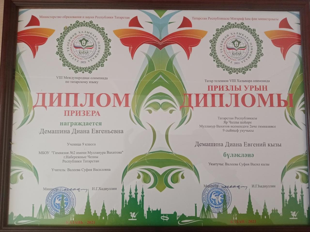 Татар теленнән VIII Халыкара олимпиадада ПРИЗЕР булган 9нчы сыйныф укучысы Демашина Диананы һәм татар теле укытучысы Валеева Суфия Васил кызын чын күңелдән котлыйбыз! фото1, фото2, фото3, фото4