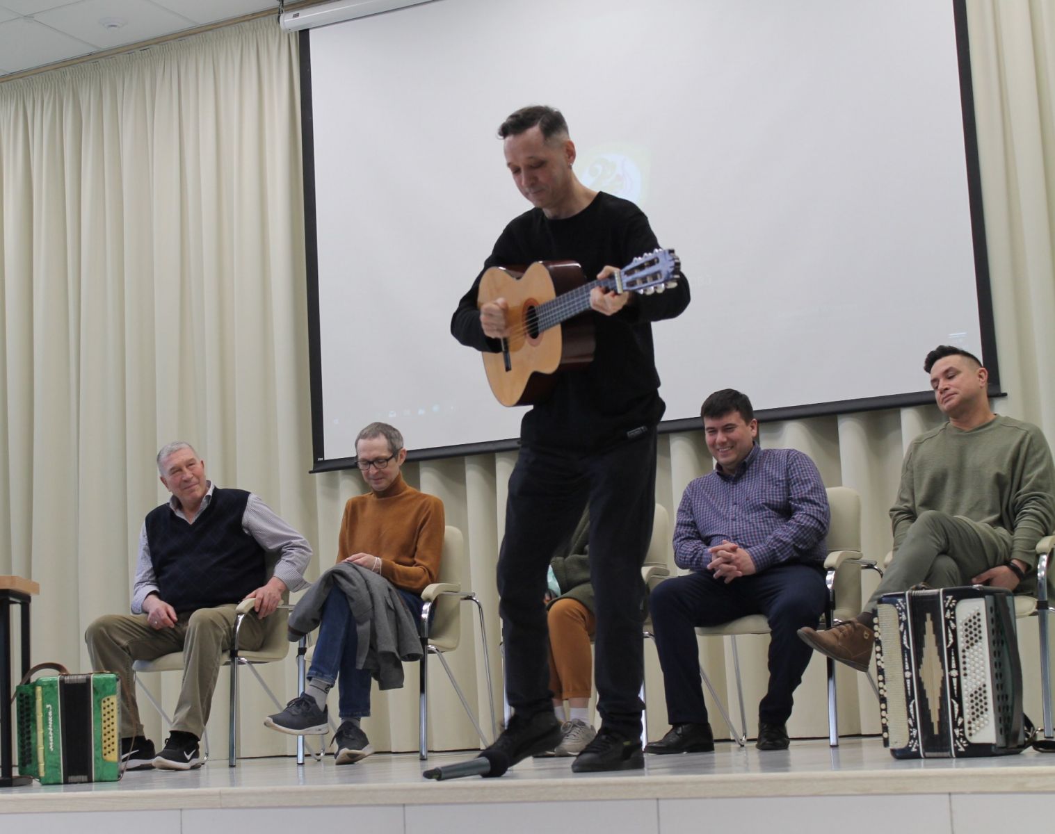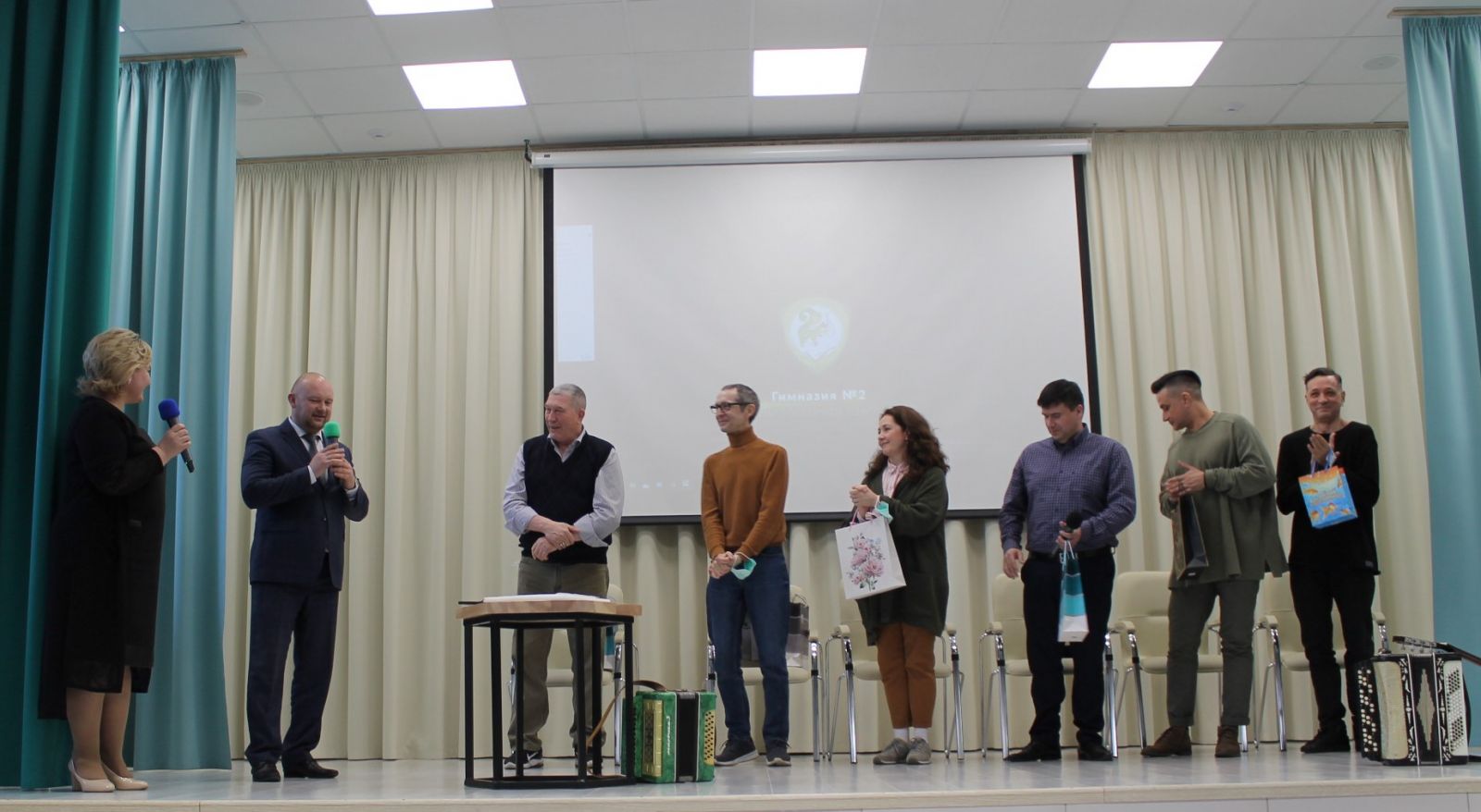 Очрашуны әзерләгән татар теле һәм әдәбияты укытучысы Энҗе Нурисламова кунаклар белән якыннан таныштыра башлады. Безгә килгән артистлар җырчы да, биюче дә, нәфис сүз осталары да ич! Укытучыларга гомере буе рәхмәтле булган Әсхәт абый “Хәтерлим мин әле бүгенгедәй” җырын башкарды. Илтөзәр абый, тормышчан һәм мавыктыргыч итеп, химия фәнен аңлатты. Сәхнәгә Илдус Габдрахманов гитара тотып чыгып баскач, без тынып калдык. Ул, гитарада уйный-уйный, чечетка бии башламасынмы! Рамил Вәҗиев үзенең бәрхеттәй йомшак тавышы белән бик матур итеп шигырь укыды. Ирек Кашапов “Синең куллар, әнкәй ” җырын башкарды. Зал алкышларга күмелде.