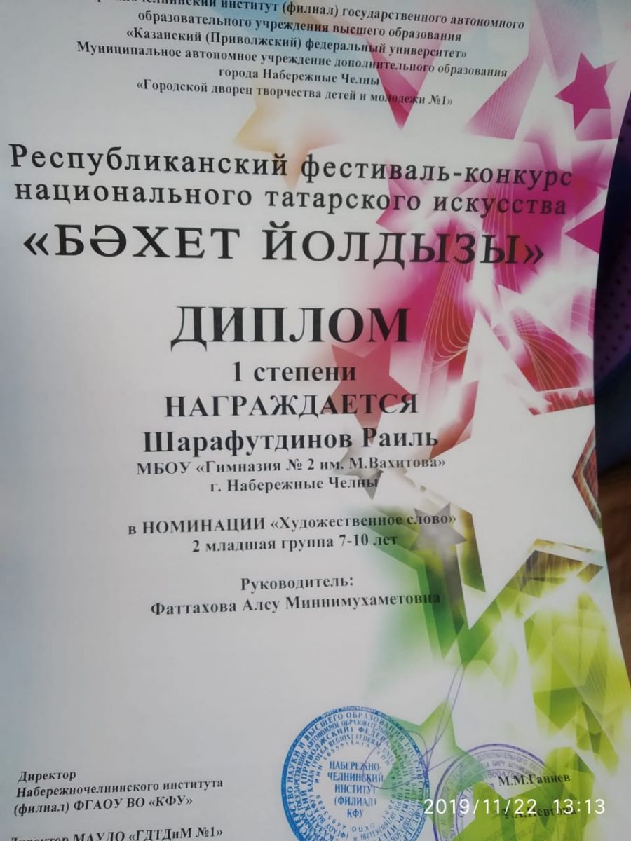 Сагидуллину Элҗвину (Диплом 3 степени), Гафиятову Луизу (Лауреат 3 степени),