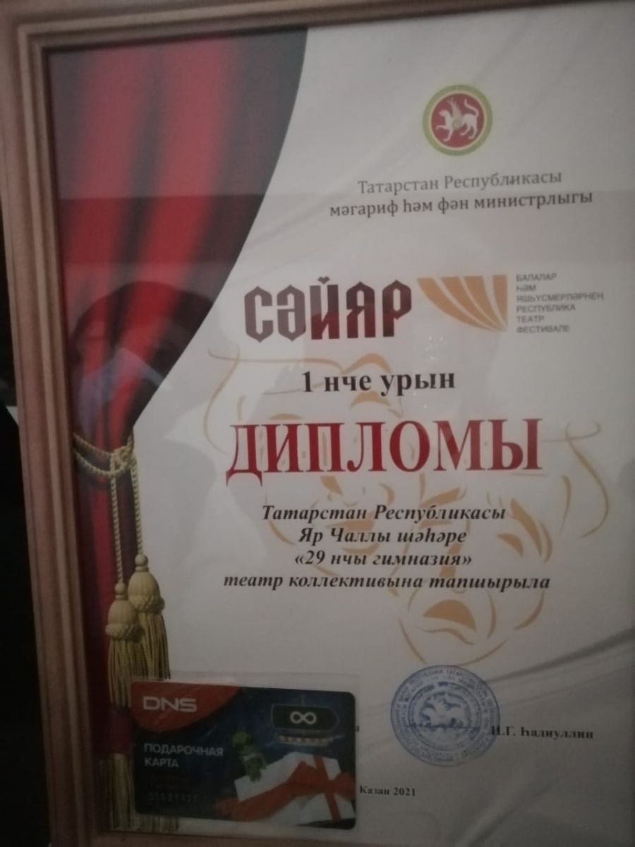 Казан шәhәрендә "Халыклар дуслыгы йорты" нда, 6 нчы тапкыр үткәрелгән "Сәйяр" балалар hэм яшьүсмерләр театр фестиваленең бүләкләү тантанасы үтте. Гимназиянең театраль коллективы беренче урын яулады.