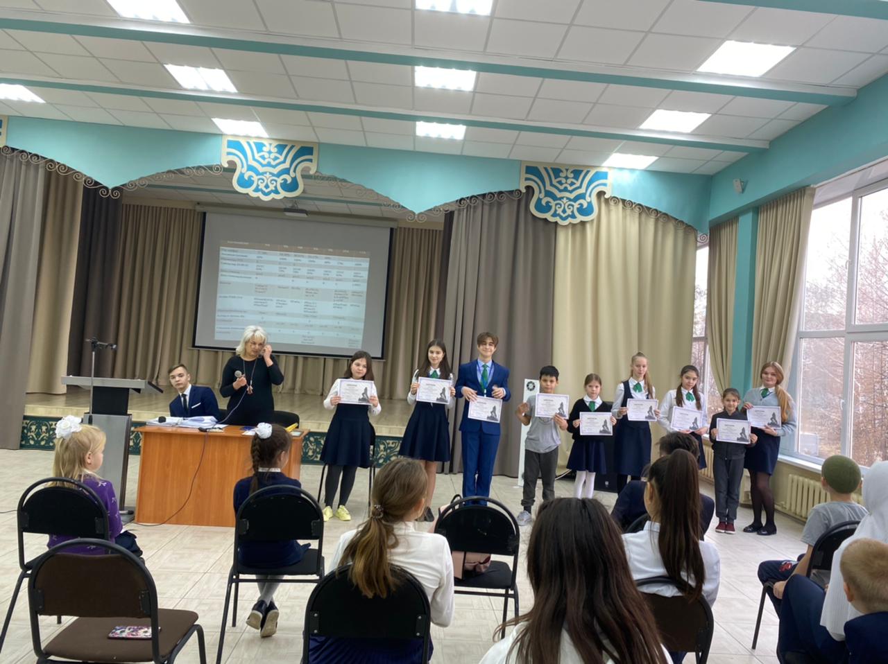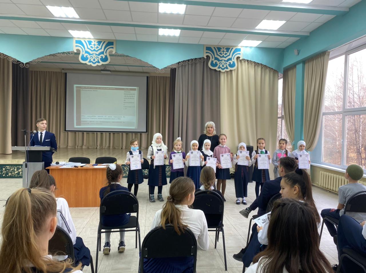 11.11.21. Беренче чирек нэтижэлэре буенча линейка утте.Линейкада hэр класстан бер жаваплы укучы катнашты.Чирек дэвамында уткэрелгэн барлык чараларга нэтижэ ясалып, жинучелэргэ грамоталар, дипломнар, рэхмэт хатлары тапшырылды.Классларнын активлыгына карап, лидер класслар билгелэнде.