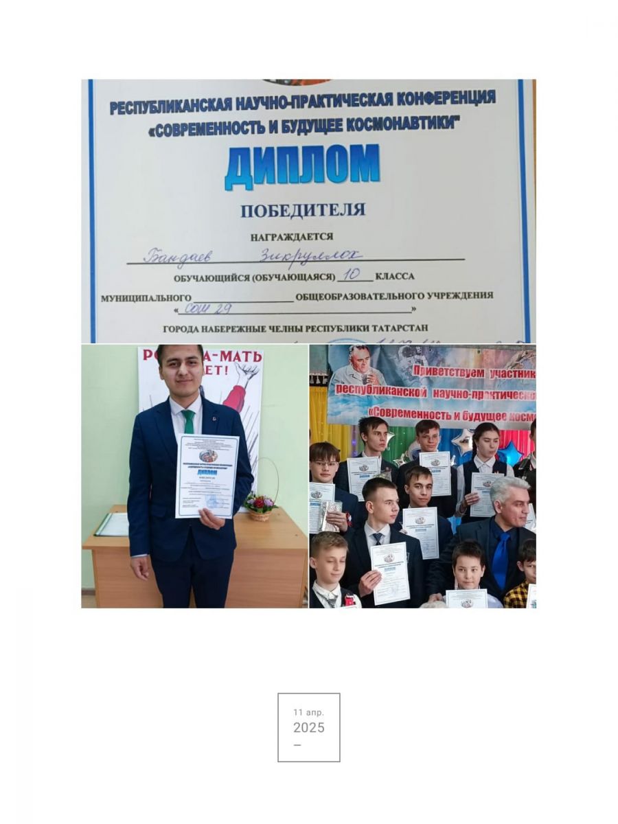 Поздравляем Бандаева Зикруллоха, ученика 10 класса и Лилию Дамировну с победой на Республиканской научно- практической конференции "Современность и будущее космонавтики". Зикруллох выступал с очень интересной темой, с интеграцией астрономии, физики и биологии.