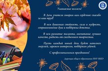 Уважаемые коллеги! В день учителя говорим вам огромное спасибо за ваш труд! В нём душевная стойкость, сила и мудрость, соприкосновение душ и поддержка детства! В нём развитие таланта, воспитание лучших качеств, радость от ежедневного творчества. Пусть каждый день будет наполнен энергией, заряжен интересом, поддержан удачей. С профессиональным праздником!