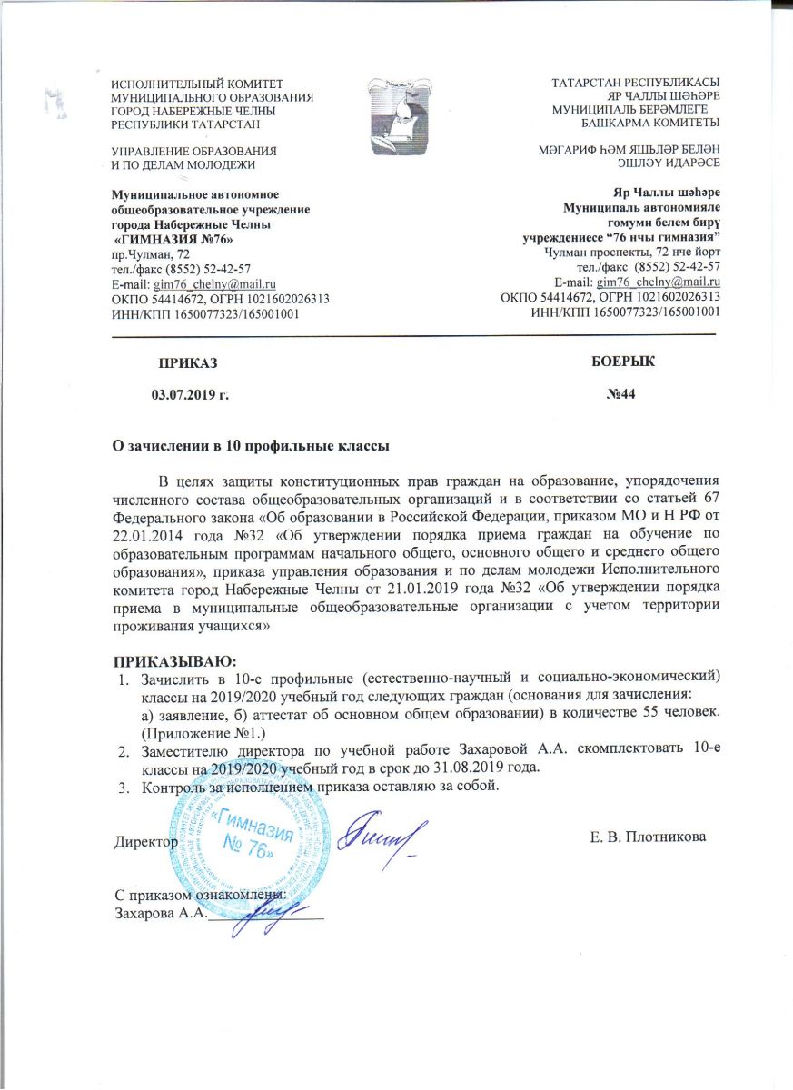 Прием в 10 классы на 2019/2020 учебный год закрыт. Приказ о зачислении в 10 классы от 03.07.2019 №44