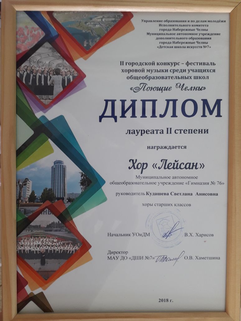 Хор « Лейсан» Гимназии 76 под руководством учителя музыки Кудашевой Светланы Анисовны стали лауреатами II степени II городского конкурса - фестиваля хоровой музыки среди учащихся общеобразовательных школ. В конкурсе участвовали 27 хоровых коллективов. Ребята из 5В, 6В и 7А класса великолепно исполнили песню « Мир без войны». Желаем нашему хору новых побед!