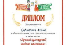 Суфиярова Алина стала победителем республиканского конкурса "Лучший культурный дневник школьника" 30.05.2016