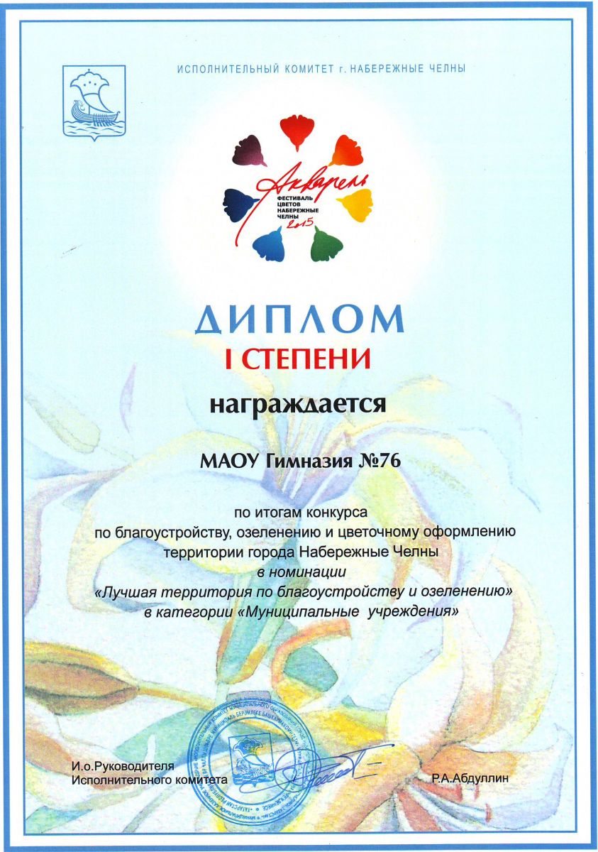 Диплом I степени в муниципальном конкурсе по благоустройству, озеленению и цветочному оформлению территории города Набережные Челны в номинации "Лучшая территория по благоустройству и озеленению" в категории "Муниципальные учреждения"