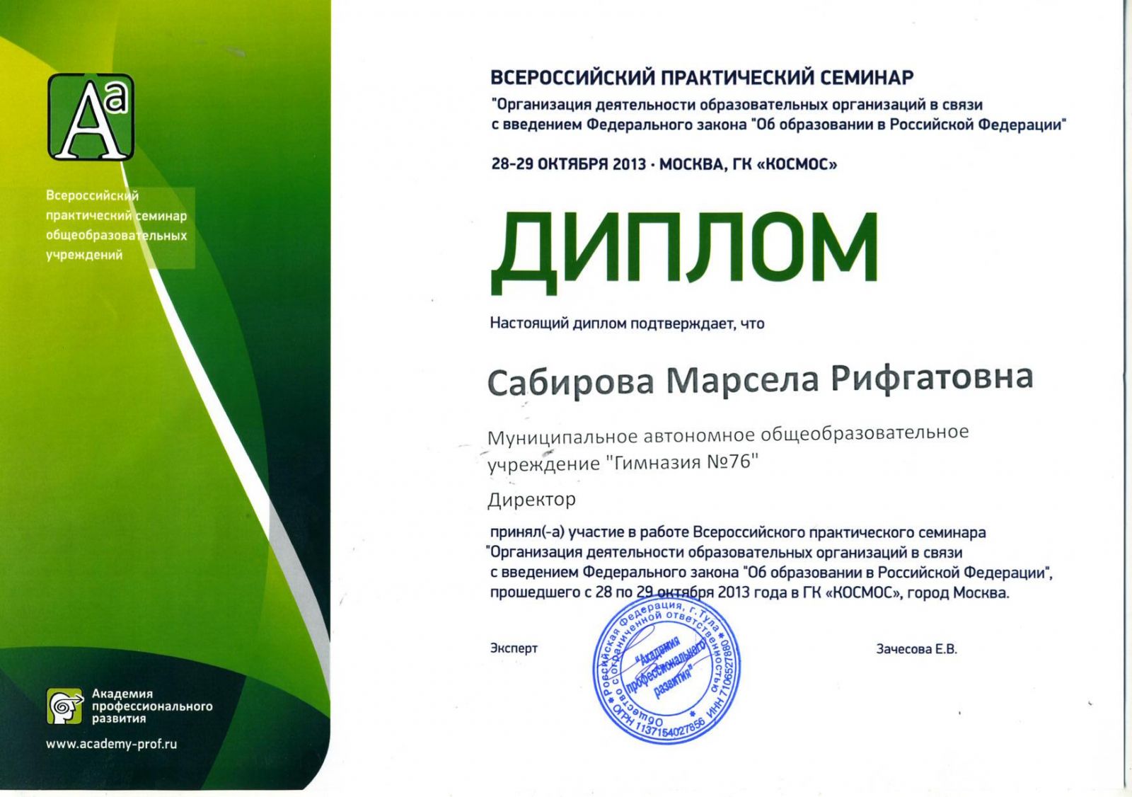 28 - 29 октября 2013 года. Участие в работе Всероссийского семинара "Огранизация деятельности образовательных организаций в связи с введением федерального закона "Об образовании в Российской Федерации"