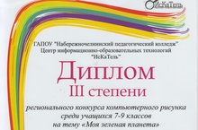 Учащийся 8в класса Бадин Алексей стал обладателем Диплома III степени на региональном конкурсе компьютерного рисунка среди учащихся 7-9 классов на тему "Моя зеленая планета" в номинации компьютерный рисунок. Руководитель Гаянова Н.Н.