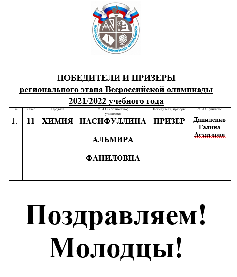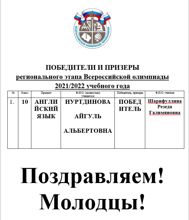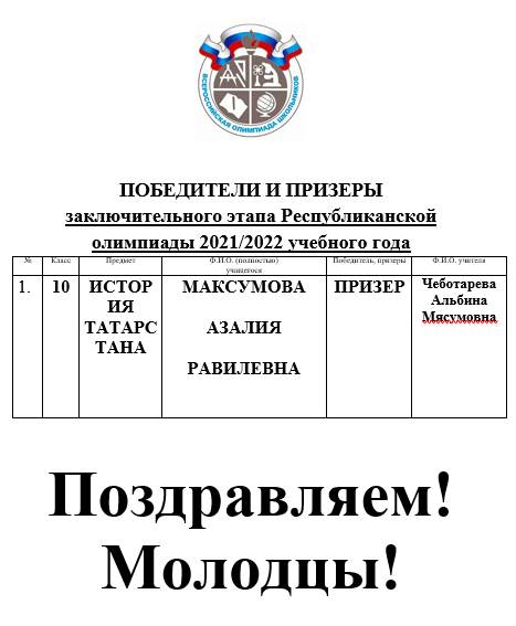 ПОБЕДИТЕЛИ И ПРИЗЕРЫ заключительного этапа Республиканской олимпиады 2021/2022 учебного года