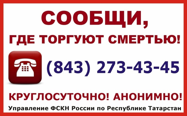 Если вы стали свидетелями преступления, связанного с незаконным оборотом наркотиков и содержанием наркопритонов обращайтесь по круглосуточным телефонам 02, 112 или по «телефону доверия» МВД по Республике Татарстан 291-20-02.