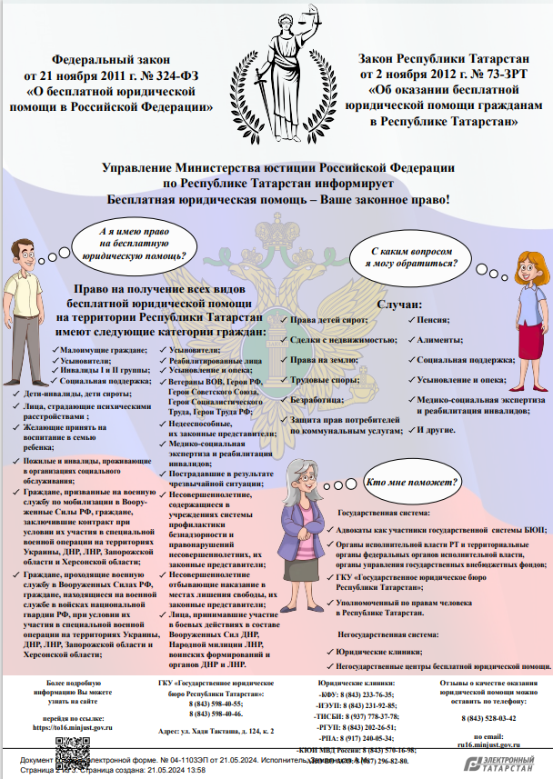 Опубликовано: 30.05.2024Управление Министерства юстиции Российской Федерации по Республике Татарстан (далее – Управление) во исполнение п.1.1.1.4. протокола заседания Координационного совета при Главном управлении Минюста России по Нижегородской области от 07.06.2023 № 1 о разработке и распространении среди населения материалов просветительского характера о получении гражданами бесплатной юридической помощи на территории республики (методичек, брошюр, памяток, буклетов) направляет для распространения среди населения и размещения на официальных сайтах, в социальных сетях и мессенджерах, информационных стендах разработанную Управлением брошюру (буклет) о получении гражданами бесплатной юридической помощи на территории Республики Татарстан.